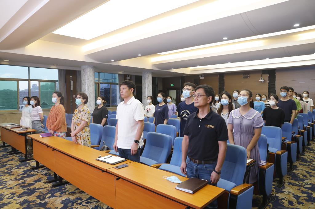 在庄严的国歌声中,活动拉开序幕。3名毕业生党员代表分别结合自身实际给大家分享了自己作为党员的青春时光。入选我校22届研究生支教团、英语系学生陈静结合自身支教经历,畅谈自己对支教、教育的一些思考和认识,并表达了努力成一位名优秀党员、继续为教育事业奋斗的梦想;考取大连外国语大学研究生、日语系学生彭祖桥回顾自己由一名本科生顺利成长为一名研究生的青春,在学校生活中的成长与进步。他由衷地感谢母校、母院和恩师对他的培养,在校期间出国交流学习让他培养了国际视野、天下情怀;保送北京外国语大学研究生、英语系学生孙艾林从宏观的角度阐述了自己作为一名外语新闻传播者,在后疫情时代应有的担当和作为。