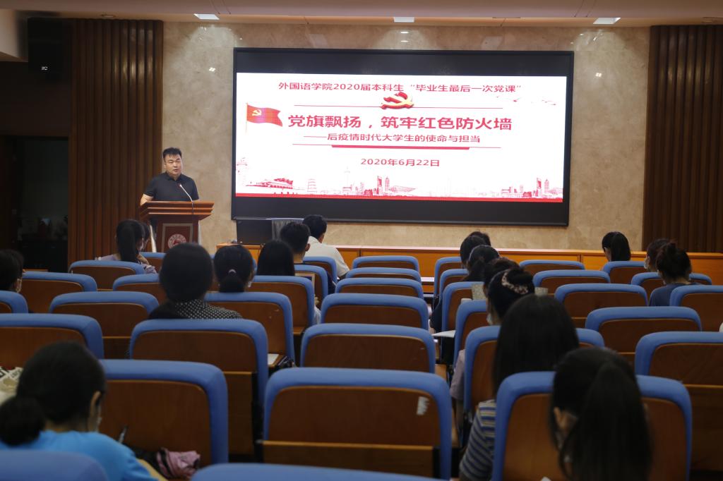 (通讯员:舒怡 杨兆晨)6月22日晚,威尼斯金沙官网在515报告厅举办以“党旗飘扬,筑牢红色防火墙——后疫情时代大学生的使命与担当”为主题的本科毕业生党员最后一堂党课。学院党委书记唐建文、副书记贺慧星,学工办全体老师和2016级毕业生党员、预备党员一同参加了此次“特殊”的党课。