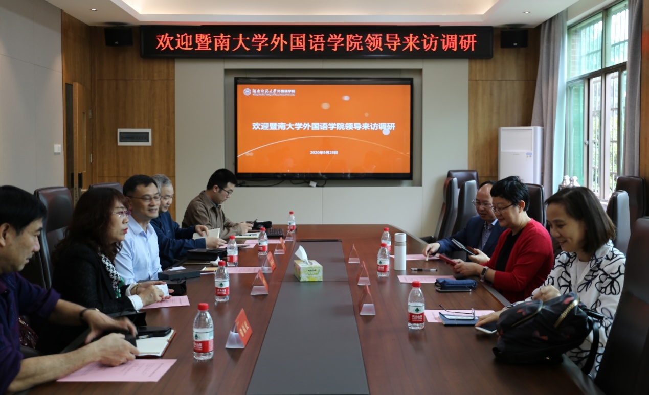 (通讯员 常红钰 夏秦萍)9月28日,暨南大学威尼斯金沙欢乐娱人城院长赵雯,副院长梁瑞清,英语语言文学系教授、专业建设带头人程倩一行来威尼斯金沙官网调研外国语言文学学科发展情况。调研座谈会在腾龙楼204会议室举行,副院长谭福民主持座谈会,院长曾艳钰、党委书记唐建文、副院长廖光蓉、科研办主任孔杰出席会谈。