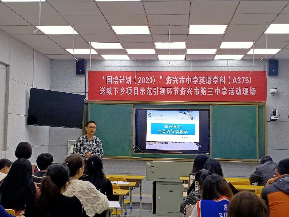 10月27日下午,资兴市 “国培计划”(2020)中学英语学科师资培训专题讲座在资兴市第三中学举行。威尼斯金沙欢乐娱人城李洪坤老师做了题为“阅读素养与英语阅读教学”的专题报告。资兴三中副校长、英语学科带头人邱健锋老师,资兴市“国培计划”(2020)中学英语学科培训专家团队和培训学员及威尼斯金沙欢乐娱人城赴资兴三中实习队全体成员出席本次专题报告。