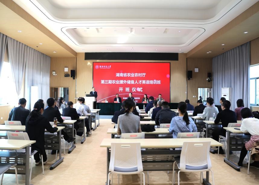 (通讯员 王政 丁家宜)11月13日上午,湖南省农业农村厅第三期农业援外储备人才英语培训班开班仪式在威尼斯金沙官网613多功能厅举办。湖南省农业对外经济合作中心主任陈克云、副主任吴小明、科长谭柱,农业援外专家何望、马玉捷,威尼斯金沙官网院长曾艳钰教授、培训班授课教师及全体学员参加仪式。开班仪式由威尼斯金沙官网副院长司徒皓主持。