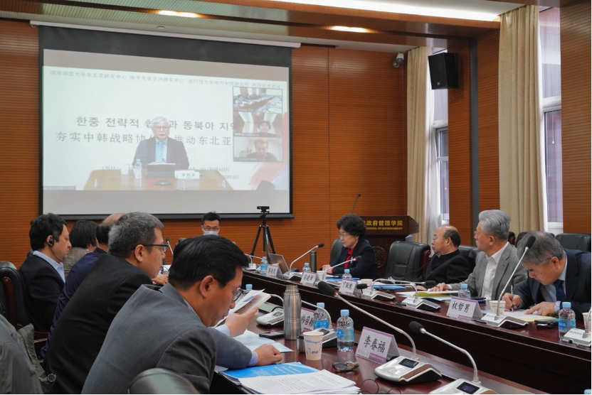 会议的第二议题由南开大学周恩来政府管理学院韩召颖教授主持,我校东北亚研究中心蔡美花主任围绕推进中韩人文交流的路径和方法进行发言,指出利用地方文化特色,抓住“中韩文化交流年”的重要历史机遇,推动中韩人文交流进行发言。韩国成均馆大学成均中国研究所张荣熙教授就世界秩序转变背景下,如何增强中韩人文交流、开展文明对话路径进行了深入探讨。延边大学经济管理学院权哲男院长、韩国东国大学朝鲜学研究所则从经济角度,评析了朝鲜当前的经济现状及未来发展走向。