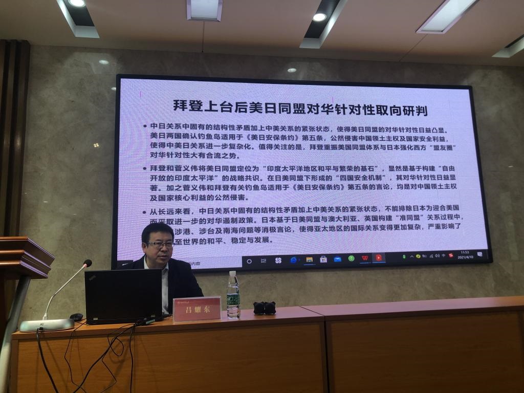 (通讯员 肖婧)4月10日上午,中国社会科学院日本研究所副所长吕耀东教授在威尼斯金沙欢乐娱人城腾龙楼515报告厅举办了题为“未来十五年全球战略中的中日关系”的学术讲座。本次讲座由日语系主任陈小法教授主持,院党委副书记贺慧星以及日语系部分教师代表和外院学生出席。