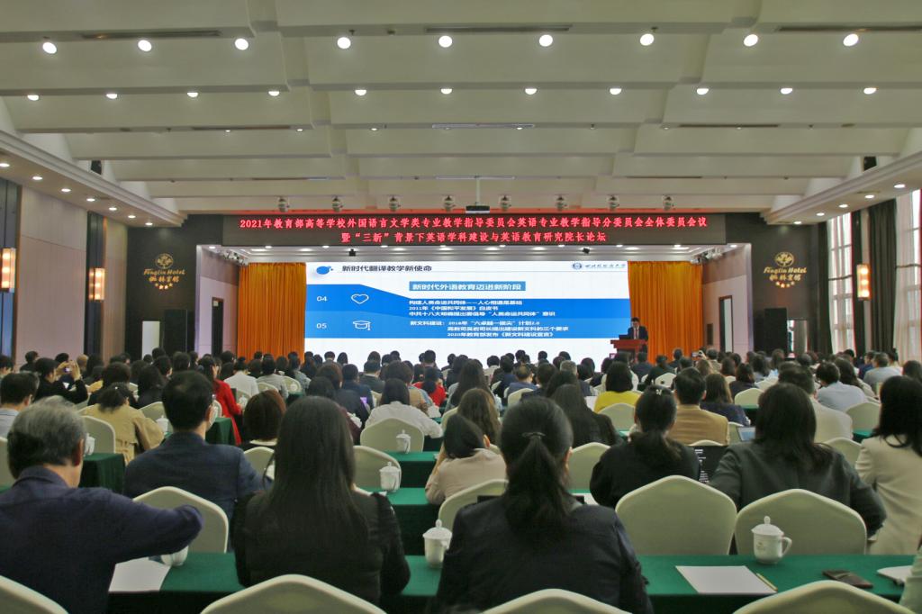 (记者 董飞 万语烁)4月29日,由我校和外语教学与研究出版社承办的2021年教育部高等学校外国语言文学类专业教学指导委员会英语专业教学指导分委员会全体委员会议暨“三新”背景下英语学科建设与英语教育研究院长论坛在我校召开。省教育厅党组成员、省委教育工委委员左清,英语专业教学指导分委员会主任委员、我校党委书记蒋洪新出席会议。
