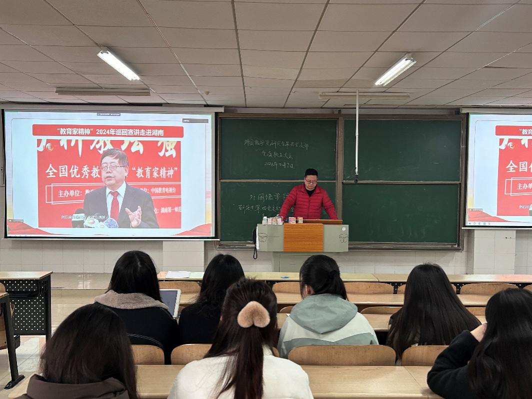 党课过程中,支部书记根据主题,从“教育家精神”的内涵与特点,“教育家精神”2024巡回宣讲走进湖南”,未来青年教师如何传承“教育家精神”三个方面讲述了我们外语师范生如何践行教育家精神内涵,也使我们更加明确了自己作为一名人民教师的使命担当。
