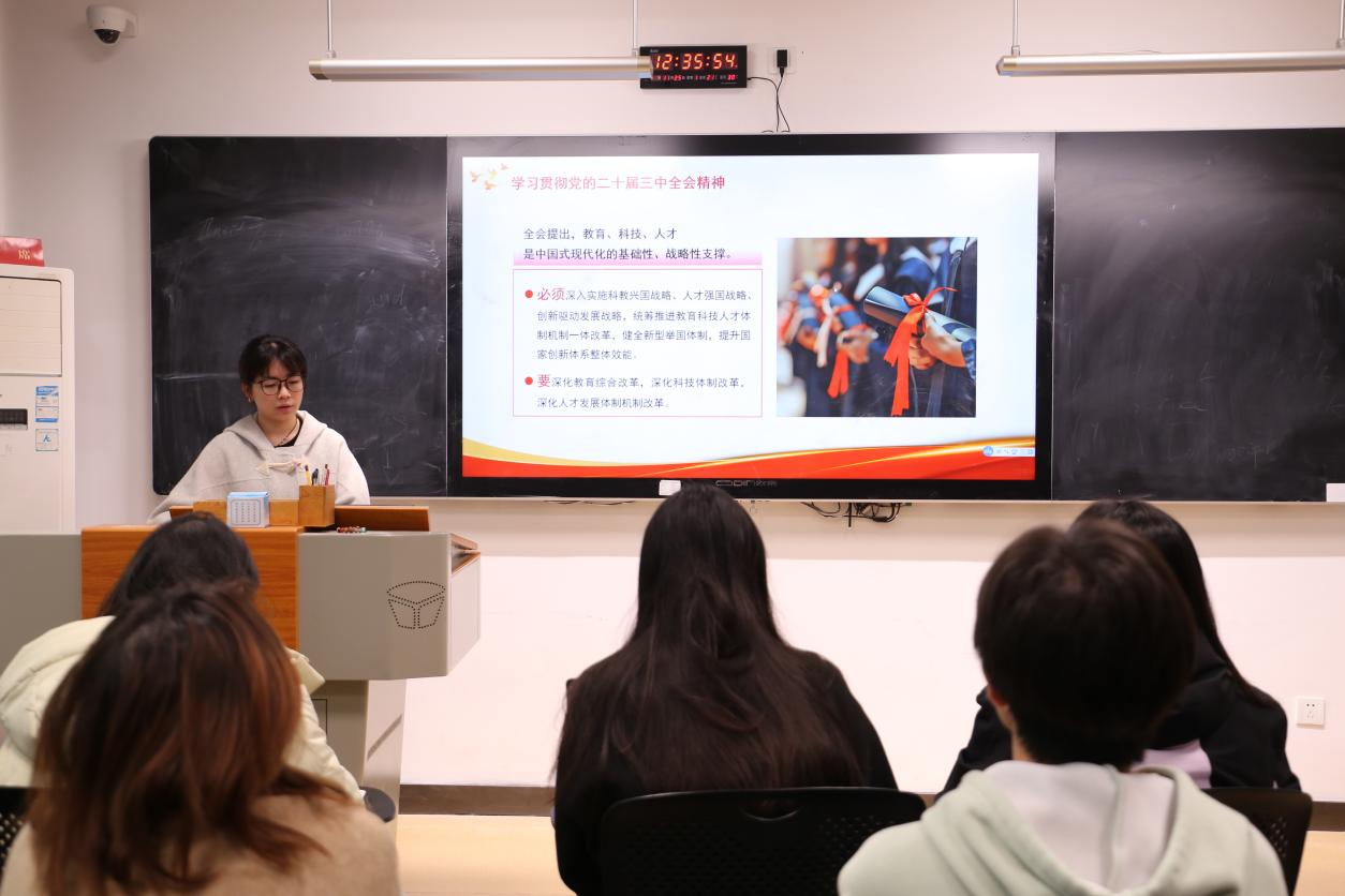 本科生第一党支部通过“三会一课”、“一月一课一篇一实践”主题党日活动,贯彻党的二十届三中全会精神,党员同志们自觉用习近平新时代中国特色社会主义思想武装头脑、指导实践。