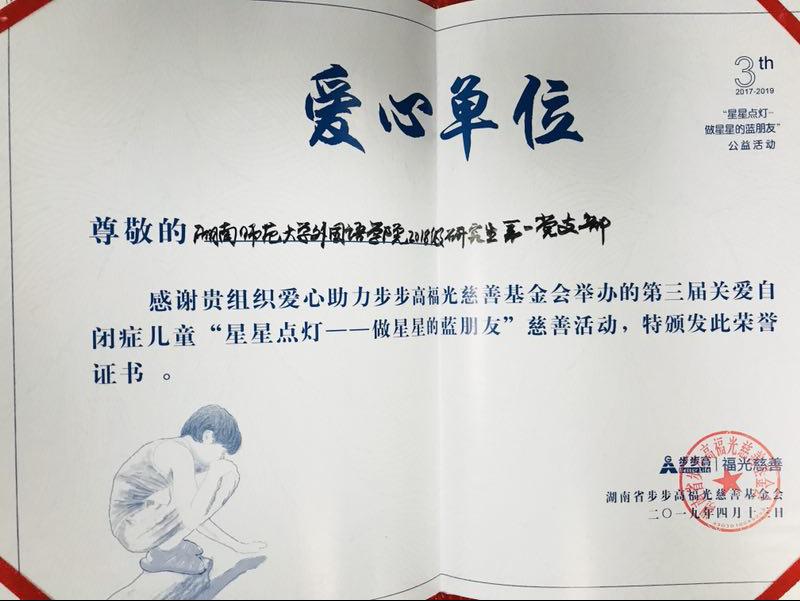 当晚,湖南新闻联播对此次公益活动进行了报道,中国新闻网,长城网,澎湃网等各大媒体也纷纷对此次公益活动进行了宣传和报道。2018级研究生第一支部的同志们在此次公益活动中凭借出色的表现获得了主办方颁发的荣誉证书。参与此次公益活动不仅让一支部的同志们加深了对自闭症儿童的了解,为孩子们带去一缕温暖,同时也为营造一个包容的与接纳的社会氛围贡献了一份力量。