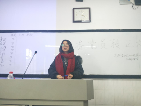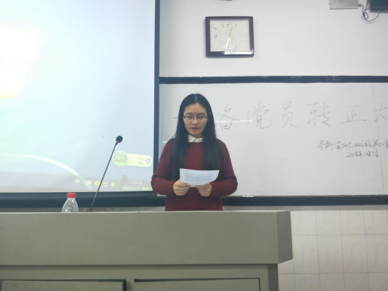 会上刘丽严格按照预备党员转正程序,组织申请转正的预备党员汇报预备期间思想、学习、工作等方面的表现。支部委员作为入党介绍人,对8名预备党员作出评议,指出了每位同志的优点和不足。其中李方婷等同志在预备期间加强思想学习,积极投身学习、工作,获得了支部成员的一致肯定。