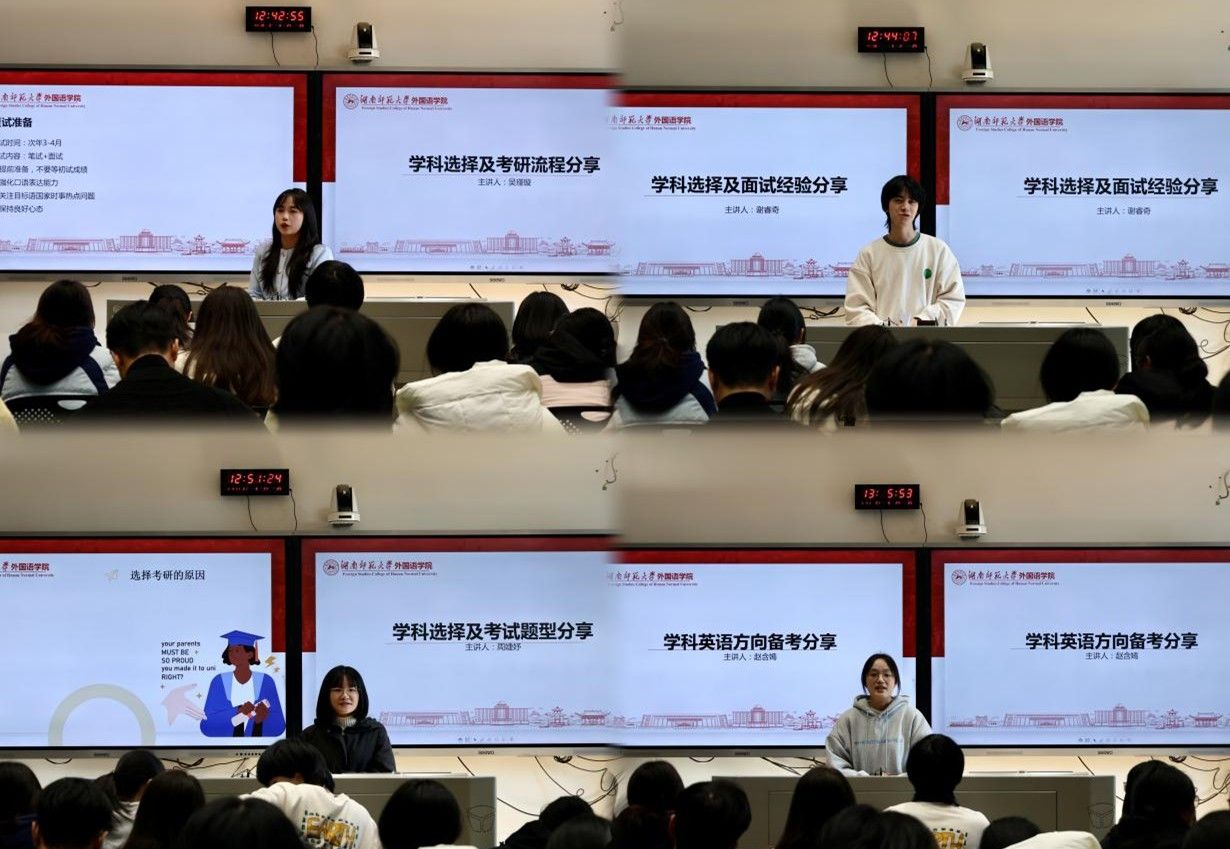 活动中,吴瑾璇聚焦学科选择、考研关键时间节点和报考全流程及备考阶段规划,为同学们分享了具体考研学科经验;谢睿奇结合自身考研经历,建议学生充分依托本校资源优势获取备考信息,并细致分享了相关面试技巧及注意事项;周婕妤从考研初衷和备考核心阶段出发,系统介绍了公共课与专业课备考要点;谢含嫣围绕学科选择与备考实践,向同学们推荐了框架式学习与真题演练相结合的高效备考路径。