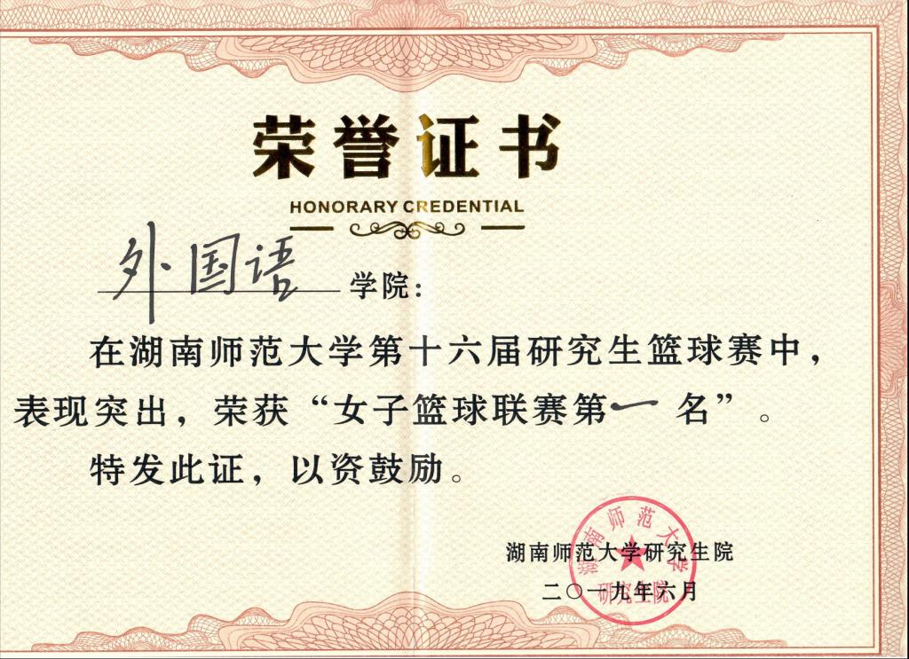 2019年外院女篮荣获第16届篮球联赛一等奖