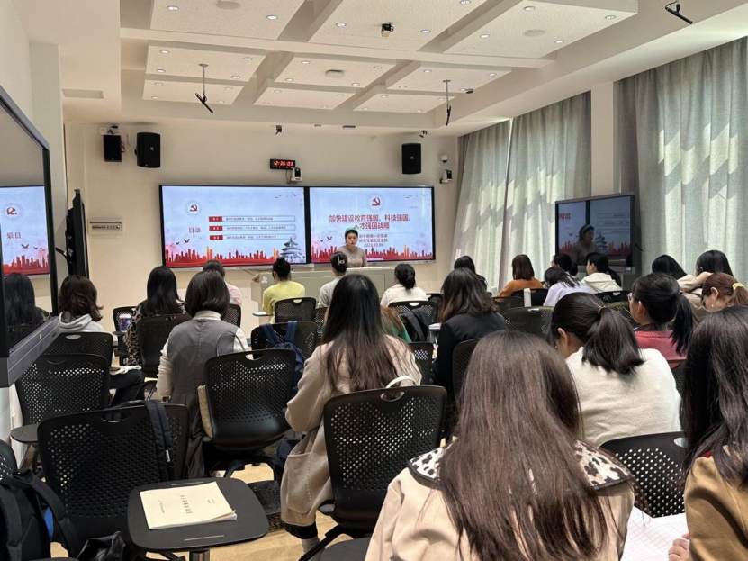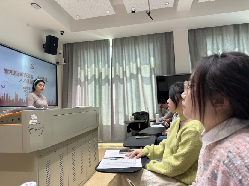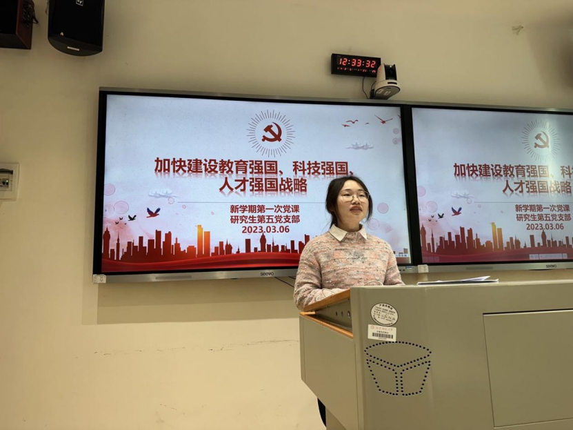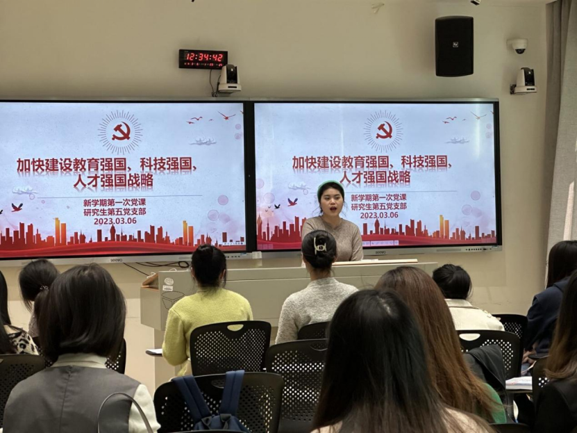 (通讯员:李文璇)2023年3月6日,威尼斯金沙欢乐娱人城研究生第五党支部书记王佳老师在腾龙楼304为支部党员讲授了新学期第一堂党课,主题为“加快建设教育强国、科技强国、人才强国战略”。