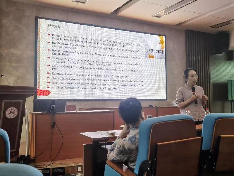 随后,王丽亚教授以美国小说《了不起的盖茨比》为例,从文学四要素出发,生动阐述了“作者主题与修辞意图”,“文本形式现象”以及“阅读反应和文本构建的读者”三者之间的动态关联。王丽亚教授以深入浅出的方式,为同学们介绍了叙事学三大理论基础,并引出“隐性进程与双重叙事动力”这一叙事学创新理论。接着,王教授还例举了《简爱》,《傲慢与偏见》以及《远大前程》等大家耳熟能详文学作品,并对这些案例进行结构主义叙事分析,让在场师生对叙事学分析的方法论有了更深层次的了解。