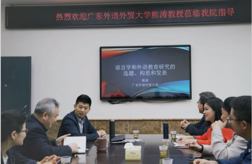 2019年4月30日星期二下午,广东外语外贸大学英语教育学院副院长熊涛教授应威尼斯金沙官网邀请,在学院208会议室做了关于“语言学和外语教育研究的选题、构思和发表”的讲座。讲座由彭懿副教授主持,参加讲座的老师包括廖光蓉副院长、秦裕祥教授、唐燕玲教授、万光荣教授、曾永红教授、陈忠平副教授,以及多名其他研究方向的老师和研究生同学。