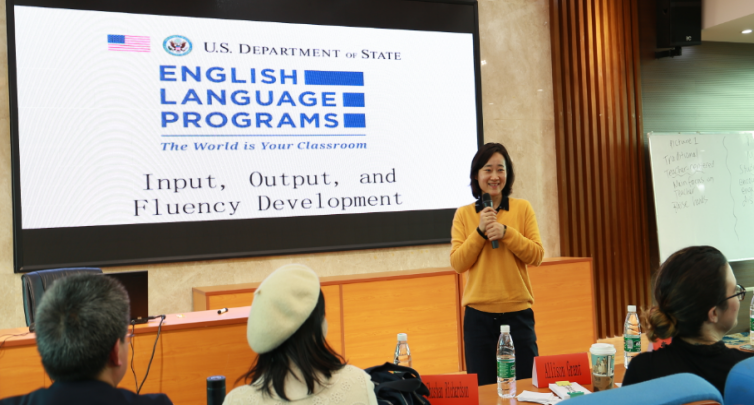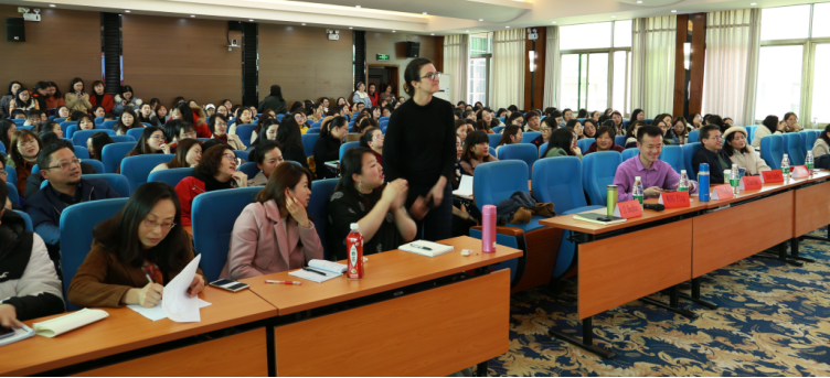 两场讲座的主讲嘉宾均是美国国务院聘请的资深英语语言教育专家。Allison Grant女士讲座的主题是通过单词卡片教词汇。她以实际例子为大家阐释了词汇教学中制作单词卡片的必要性、制作流程及老师在利用卡片进行课堂教学时应担任的角色,并选取了16位学员现场指导他们如何制作单词卡,以帮助学生高效学习词汇。Shushan Richardson女士讲座的主题是阅读中输入、输出和流利度发展的问题。她通过一篇短文告诉大家,在教阅读文章时,我们可以设置三个层次的问题,分别是信息层次、推理层次和价值判断层次。通过这三个层次的问题,我们可以引导学生理解原文,锻炼思辨能力,引领价值判断,达到学习知识、体悟文化、培养心智、陶冶性情的目的。两位专家的讲座给我们带来了英语教学方面的知识与技能,同时,她们的现场示范,让我们感受到了美国本土英语教师的课堂魅力与教育理念。