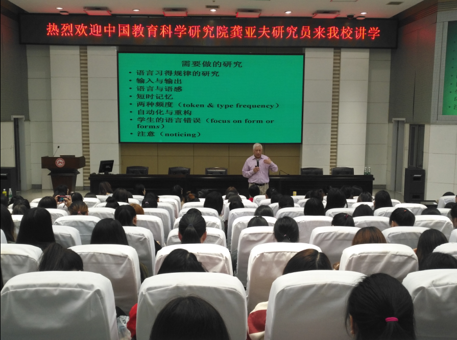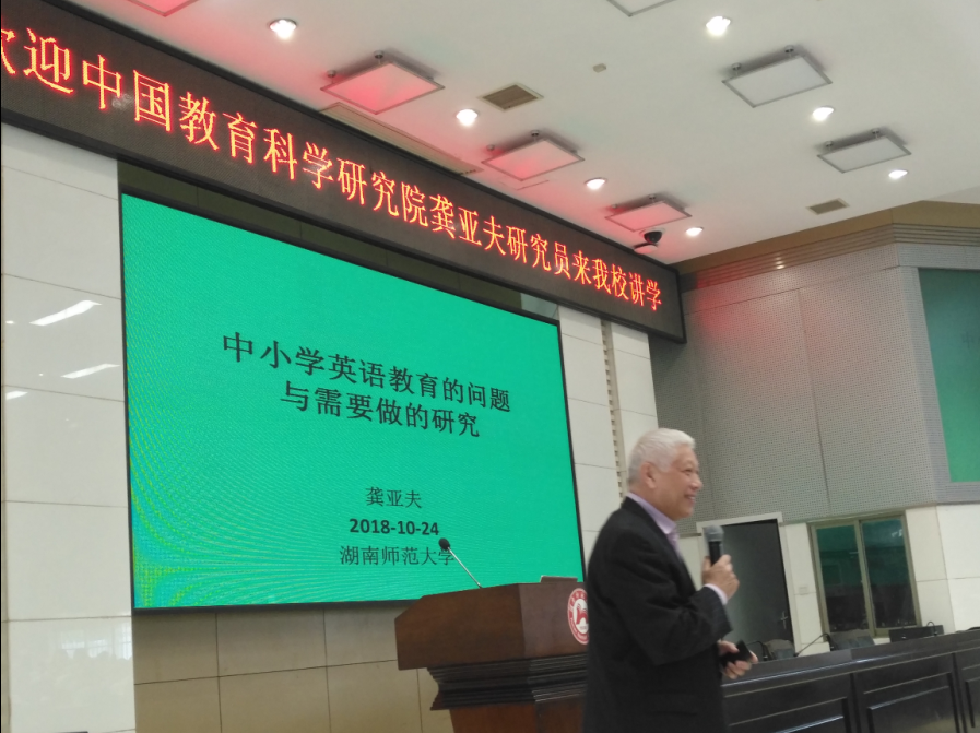 (通讯员李洪坤)10月24日上午,中国教育学会外语教学专业委员理事长龚亚夫研究员应邀到我校至善大讲堂作“中小学英语教育的问题与需要做的研究”的学术讲座。威尼斯金沙欢乐娱人城副院长廖光蓉教授担任主持人,英语系学科英语教研室全体老师,长沙市岳麓区小学英语黄梦娟教研员率该区60多位小学英语老师出席了这次讲座。聆听这次讲座的还有威尼斯金沙欢乐娱人城本科生、研究生等共计近300人。