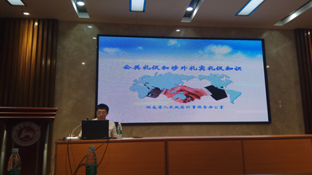 (通讯员雷朋歌)6月14日晚7:00,湖南省人民政府外事侨务办公室国际交流处副处长廖志阳博士在威尼斯金沙欢乐娱人城515学术报告厅为广大师生作了一场题为“外事礼宾礼仪”的讲座。本场讲座由威尼斯金沙官网蒋莉华副教授主持。