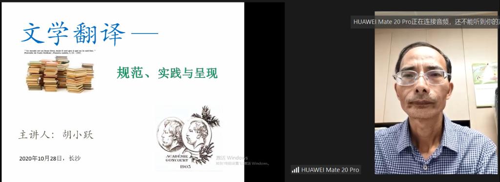(通讯员 肖茜)10月28日下午,深圳出版集团海天出版社海外部主任、法语译审胡小跃在Zoom平台上做了题为《文学翻译的规范、实践与呈现》的线上学术讲座。胡小跃译审为中国作家协会会员、中国翻译家协会专家会员、中国法国文学研究会理事、龚古尔奖中国评选评委,曾任深圳市外国文学研究会副秘书长。2002年,胡小跃被法国文化部授予“文艺骑士”荣誉勋章;2010年,荣获第二届傅雷翻译出版奖。