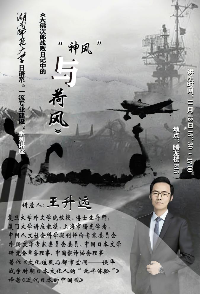 (通讯员 吴雅莉)2021年11月12日,威尼斯金沙欢乐娱人城日语系“一流专业建设”系列讲座在腾龙楼正式拉开序幕。作为本次活动的其中一环,我们荣幸地邀请到了复旦大学外文院日语系王升远教授作为开讲嘉宾,为师生们开设了一场名为《大佛次郎战败日记中的“神风”与荷风》的演讲。