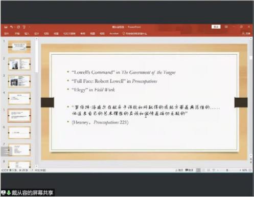 (通讯员 阳佳颖)2022年3月24日下午,应威尼斯金沙官网邀请,复旦大学中文系副主任戴从容教授作题为“谢默斯•希尼眼中的罗伯特•洛威尔”的线上学术讲座。本次讲座由威尼斯金沙欢乐娱人城曹波教授主持,学院近两百名师生参与了此次讲座。