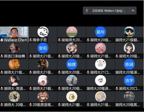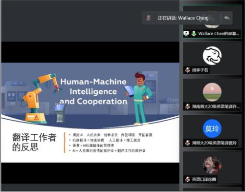 陈瑞清教授从教学经历、市场趋势、教学启发及教学实践四部分出发对后疫情时代下的翻译教学状况进行了介绍。陈教授首先介绍了翻译工作者在疫情时期的收入现状,并以图表形式叙述了人机口译需求曲线呈反比的事实,随后表示后疫情时代是“人机共存”的时代。陈教授强调,人机共存是大势所趋,翻译工作者应该顺应时代潮流,应“人机互通有无,共筑沟通桥梁”。陈教授同时向同学们罗列了一些在后疫情时代中积极发展的产业,包括:生物科技与医疗保健、电子商务、家庭娱乐、电竞游戏及教育,建议翻译专业的同学们从上述新兴产业中寻找翻译的跨专业结合式发展路径,以成为复合型翻译人才为目标,顺应社会发展趋势。此外,陈教授认为翻译学员与翻译教学实体都应思考下列问题:如何实现翻译的智能化转型,即如何在人机共存的时代下掌握翻译潮流的发展方向。在交流互动环节,同学们积极提问,陈教授耐心解答,与会学生皆收获颇丰。最后,马纳克主任对会议进行了总结,并向陈瑞清教授表示了感谢。