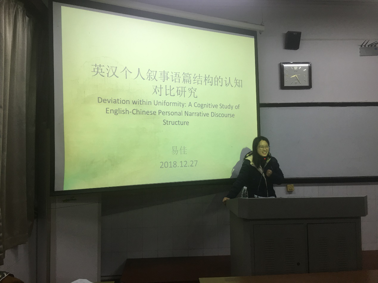 易佳博士生的主讲题目为“英汉个人叙事语篇结构的认知对比研究”。报告从个人叙事语篇结构概念的生成、表征形式以及生成机制探讨了英汉个人叙事语篇结构概念表征的共性和差异。主讲人介绍了自建语料库的规模,语料的来源与分类依据,并从语料描写与分析进一步探讨英汉个人叙事语料结构概念表征差异的社会心理动因。论坛现场气氛活跃,同学们对两位主讲人踊跃提问,点评老师对主讲人报告的标题、研究对象、研究问题、研究方法、研究思路等方面进行了精彩点评。论坛上学术的交流,思想的碰撞,火花的闪现解答了同学们研究中的困惑,指明了未来的研究方向。