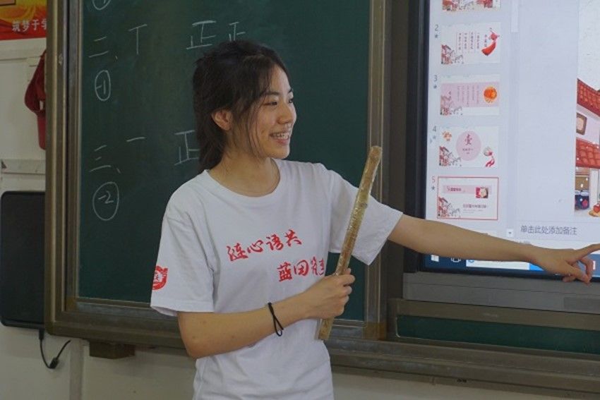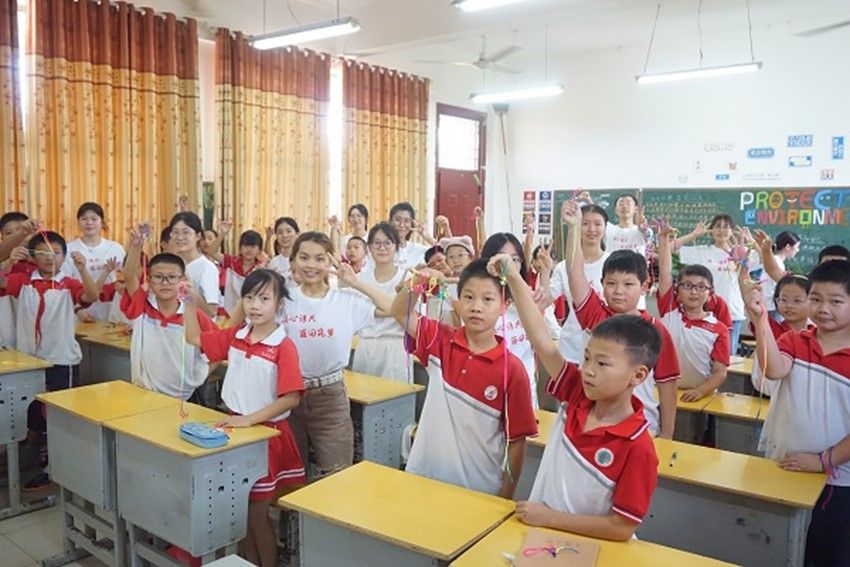 雷斯羽简要介绍了中国结的起源,以引导学生自觉思考,鼓励学生继承并弘扬这一优秀传统文化;她结合队伍主题——语言文化特色,就中国结的样式进行英译讲解;通过其余成员的面授、逐步讲解,学生基本掌握中国结的制作方法。