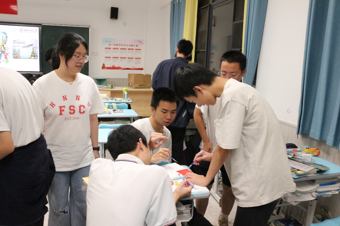 7月10日实践团成员开展“共绘友谊画”课堂。课堂中,实践团成员为学生讲解中法建交60年意义,以及和平时代的珍贵性,引导学生分组进行中法和平主题画作。学生创作激情高涨,积极与老师沟通,融合所学法语知识,完成多幅精彩画作。