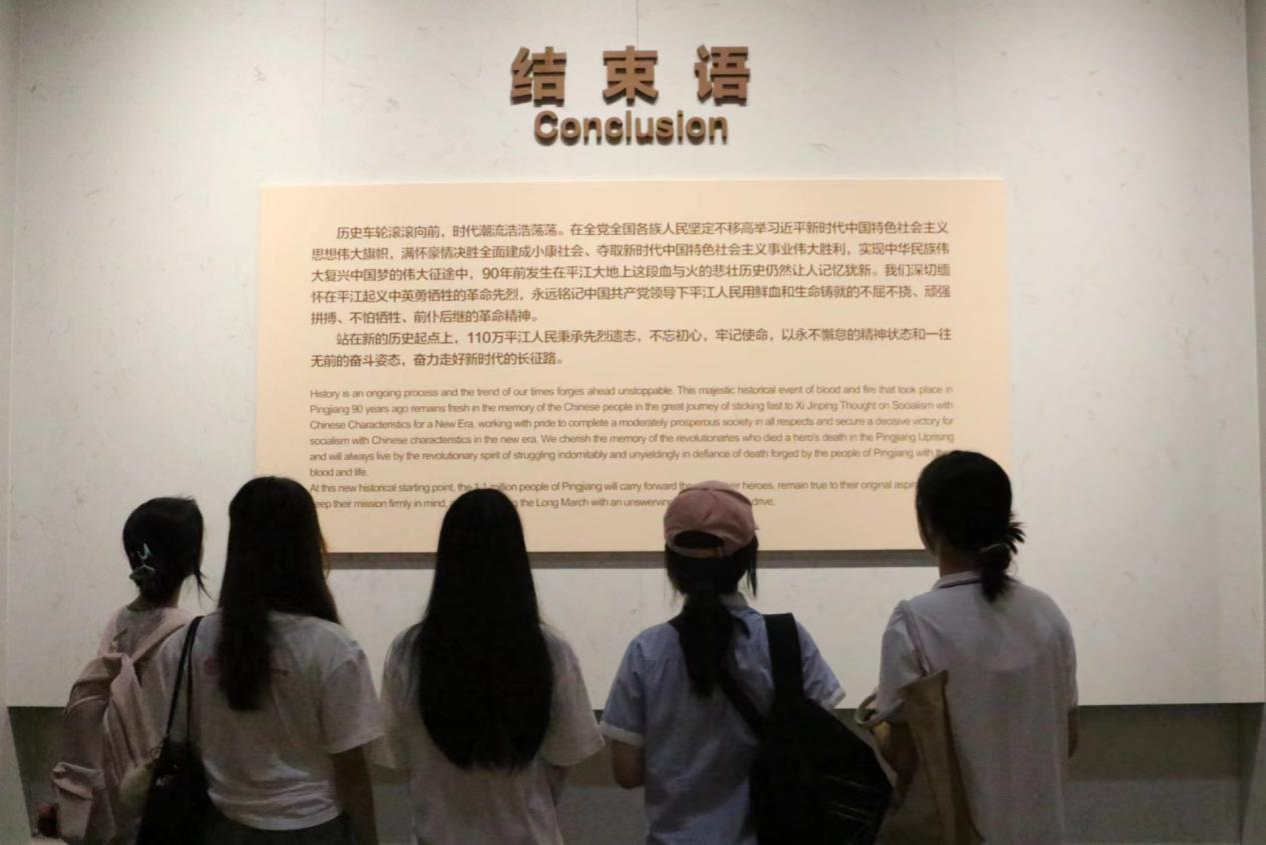 起义纪念馆共由“革命火种,点亮平江大地”“周密部署,发动平江起义”“艰苦转战,开辟湘鄂赣革命根据地”“永恒纪念,世代传承”以及特色展厅“不忘初心、牢记使命”五个展厅构成,从时间角度再现了平江起义全过程,实践团成员参观后,通过了解相关史实以及与平江颐华中学学生的交流,深化了自身对于平江县红色文化资源的认识。