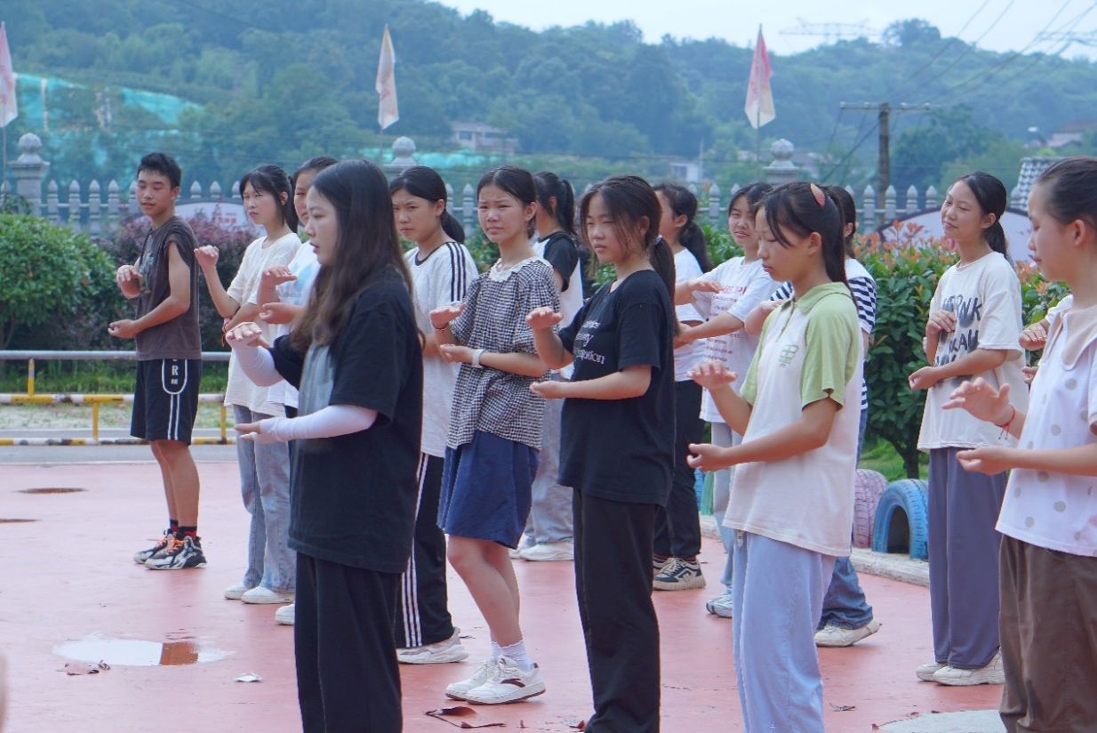 在此期间,实践团成员为所有班级开展了太极拳课程。实践团成员向学生演示并传授二十四式简化太极拳中的前四式。太极拳讲究“以柔克刚”,动作需舒缓、柔和。实践团成员循序渐进,将高难度动作,如“左右搂膝拗步”分手部和腿部依次教学。同时,实践团成员运用比喻的方式进行教学,如将“左右野马分鬃”的手部动作比作“抱球”,使其生动形象,便于学生的理解。