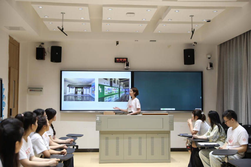 实践团成员、2020级英语口译方向研究生曹润鑫以“口译实践与旅发大会”为主题,分享了担任“新时代的中国:创新湖南融入世界”外交部湖南全球推介活动口译员的经历和故事,她希望用语言搭桥,让在实践中国的译文成为文化交流沟通的桥梁,同时以扎实的学识做好服务旅发大会的准备。实践团成员、2021级英语笔译方向研究生龙翰良分享了在张家界开展实地调研的经历,报告了主题调研的分析情况,对张家界景区和公众场所多语种标识标牌、讲解词、宣传栏在拼写、翻译、语法、语用、语义等方面提出了优化建议。